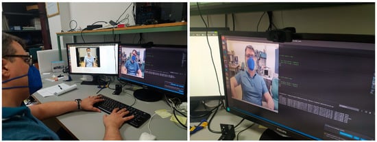 The collected dataset was analyzed one by one by selecting several frames from each video clip to obtain the ground truth about the user pose adopted in each video. So, the entire dataset was divided into three subsets: neck poses, shoulder poses and arm poses. Additionally, each subset was labeled from range 0 to range 3, according to the degrees of variation adopted by the user on each video clip (the thresholds are shown in Table 1), which was analyzed offline. Some captures about the system setup when capturing the dataset’s video clips can be observed in Figure 2.