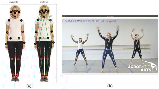 Output of the first subsystem: (a) structure and location of the skeleton’s keypoints that represent the joints; (b) execution example.