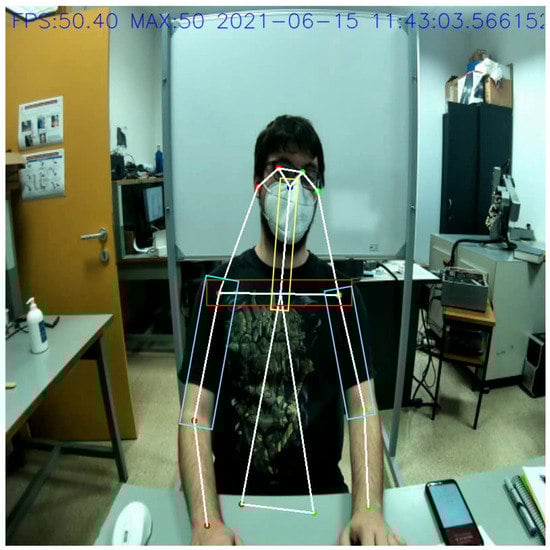 Figure 3b shows an example of the real-time execution of the skeleton estimation system. As can be seen in both figures, the shape or pose of a person is delimited by the 18 points indicated above connected to each other in a specific way.