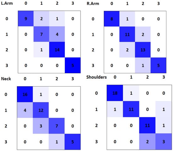 It can be observed that the best results, as shown in Table 4, are presented for the “Shoulder Alignment” parameter (Figure 5-top-right). On the other hand, we can observe two peculiar cases: one of them in “Left Arm Abduction”, where a range 0 case is classified as range 2; and the other one in “Shoulder Alignment” parameter, where a range 1 case is classified as range 3. Apart from those two errors, the rest of the errors occur from one range to a contiguous one.
