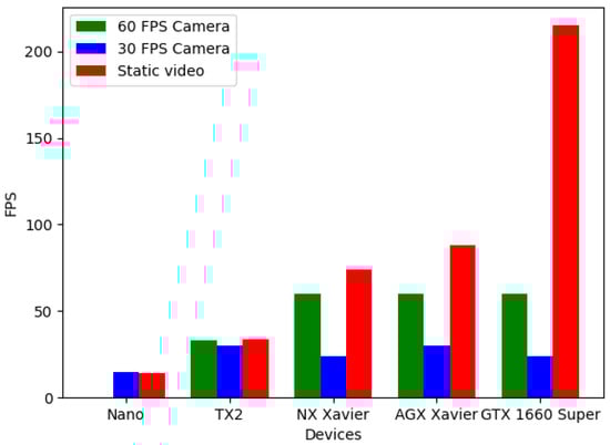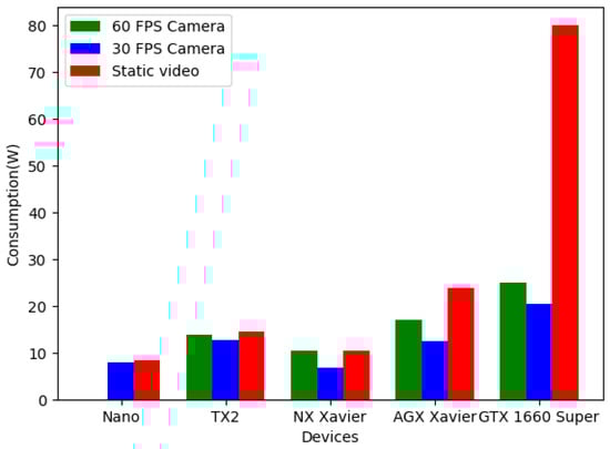 A performance study on the different hardware platforms presented was also conducted in parallel. In it, we measured the consumption and total throughput of every device while running the CNN, so that we may give at least a recommendation about which device would be a good fit for setting up a system, such as that presented, taking into account the already mentioned parameters. The results can be seen in Figure 6, Figure 7 and Figure 8.