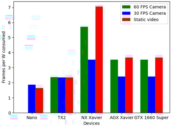 As we can see, almost all the devices presented would be a good fit; however, given the obtained results, a viable recommendation for building a system like the one presented would be the NX Xavier, as its efficiency is the maximum achieved, with 7 frames processed per watt consumed in the offline video test and 6 for the 60 FPS camera test.