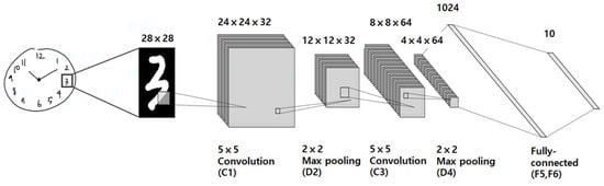 CNN network architecture for this study. It is made up of two convolution layers (C1 and C3), two pooling layers (D2 and D4), and two fully connected layers (F5 and F6). C1, the first convolution layer, filters the 28 × 28 input number image with 32 kernels of 5 × 5 size; C3, the second convolution layer, filters the down-sampled 12 × 12 × 32 feature maps with 64 kernels of 5 × 5 × 32 size. Both of the convolution layers use a unit stride, and at the output of each, a ReLU nonlinear function is used. At layers D2 and D4, down-sampling is performed with 2 × 2 non-overlapping max pooling. For the two final fully-connected layers, F5 and F6, they respectively have 1024 and 10 neurons.