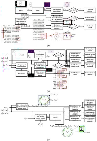 Overall flowchart of the scoring method, (a) for parameter contour, (b) for parameters hands and center and (c) for parameter numbers.