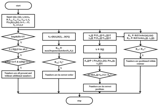 The positioning of the numbers within the contour is evaluated by using the center point , of each of the cropped number images , and the contour sensor data, and , . A circle is fitted to the contour sensor data, and , using the least squares circle fitting algorithm [37], where the center point , and the radius of the fitted circle are obtained. Similarly, a circle is fitted to the center point , using also the least squares circle fitting algorithm, where the center point and the radius of the fitted circle are obtained. Then, the positioning of the numbers is identified if the radius of the fitted circle is smaller than the radius of the fitted circle .