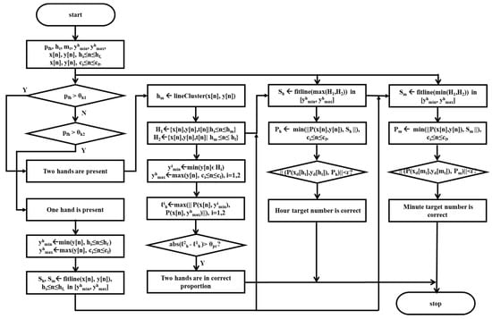 Figure 9b displays another example of the case in which two hands are present with the proper proportions and target numbers, where one of the target numbers is not in the proper position. In this case, the percentage was evaluated to be 73.37% greater than 65% the score for . Therefore, the presence of two hands was scored to be two. The length difference was evaluated to be 219.3 pixels greater than 30.0 pixels, the score for . Therefore, the correct proportion of the two hands was also scored to be one. Both of the distances and were estimated to be 57.7 and 44.5 pixels less than 200.0 pixels, the score for , respectively. Therefore, both the correctness of hand and minute target numbers were evaluated to be one. Finally, the total score of the hands parameter was evaluated to be five.