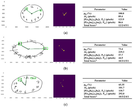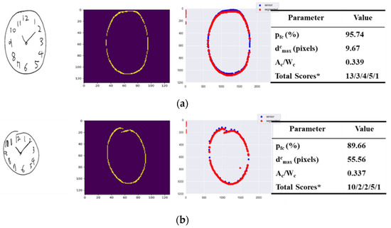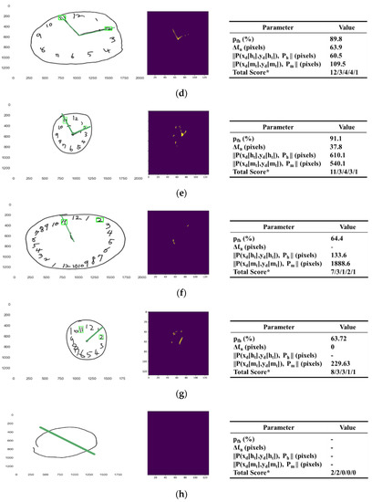As a sub-test of the Mini-Mental State Examination (MMSE), the Clock Drawing test (CDT) along with the Pentagon Drawing test (PDT) and the Rey–Osterrieth Complex Figure test (ROCF) have been widely used in neuropsychology and related areas for neurological and cognitive exams for dementias such as Alzheimer’s and others [1,2,3,4,5,6,7]. For the CDT, a qualitative neurological drawing test commonly used as a screening instrument for cognitive capabilities, a subject is asked to draw a clock showing a specific time. Placement of the numbers around the clock contour requires visual–spatial, numerical sequencing and planning abilities [8]. Drawing hands indicating a specific time requires long-term attention, memory, auditory processing, motor programming, and frustration tolerance [8]. Hence, in CDT, the test subject uses various cortical areas at the same time for the task being performed; these include use of the frontal, parietal, and temporal lobes [9,10]. As such, various cognitive skills such as selective, sustained attention, visuospatial skills, verbal working memory, visual memory and reconstruction, on-demand motor execution (praxis), auditory comprehension, numerical knowledge, and executive function can be tested [9,11,12]. It was Shulman and collaborators who employed the CDT as a screening tool for older patients for cognitive disorders and, since then, multiple studies have affirmed the utility of the CDT for screening and diagnosis of cognitive impairment for suspected pathologies such as Huntington’s disease, schizophrenia, unilateral neglect, delirium, multiple sclerosis, etc. [13]. Given the utility of CDT, studies on generating a scoring system for CDT are valuable.