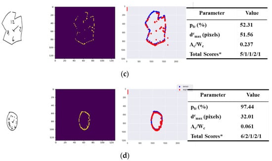 Figure 7c shows an example of an original drawing of an appropriately sized, but neither closed nor circular, contour. The segmented image has the estimated percentage of 52.31%, the maximum contour closure distance has the evaluated pixel value of 51.56 pixels, and the ratio of the contour to the CDT window sizes has the estimated value of 0.237. Both the closure and circular of the contour were evaluated to be zero, as was not greater than the 75.00 score for and was greater than the 50.00 score for ; however, the size was gauged to be one, as was greater than the 0.1 score for . Therefore, the total score of the contour parameter was evaluated to be one.
