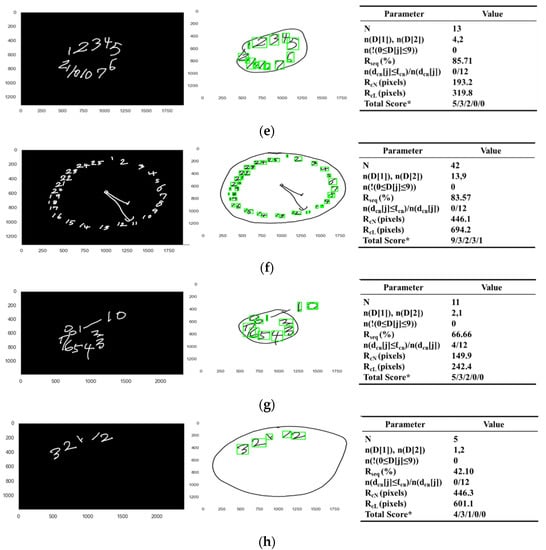 Figure 8e displays the case in which some numbers are missing and the presented numbers are not in proper positions, but mostly in correct order within the contour. The classified output , of DeepN, the pretrained model, was identified to have some missing values, since the total number N was equal to 13, and the classified output , was in the range from zero to nine, that is for all , and the numbers and were four and two, respectively. Therefore, the presence of all the numbers and no additional numbers was evaluated to be zero. The maximum ratio in percentage between the number sequence and the reference sequences , was evaluated to be 85.71%. Therefore, the correctness of the order of the numbers was evaluated to be one, since the value 85.71 of the maximum ratio was greater than 65.00, the heuristically given value of . The ratio n( ≤ )/n() of the distances , within 100.00 pixels, a given limit , was less than 0.65, a heuristically given value , where the evaluated distance for each of the digit numbers in was specifically 497.8, 462.5, 350.7, 399.3, 415.1, 254.5, 208.5, 1037.8, 836.2, 792.1, 743.6 and 952.1. Therefore, the correctness of the position of the numbers was evaluated to be zero. The radius of the fitted circle to the contour sensor data was obtained to be 319.8 pixels. The radius of the fitted circle to the center point , of each of the cropped number images , was obtained to be 193.2 pixels. Now, the positioning of the numbers within the contour was evaluated to be one, since the radius of the fitted circle is smaller than the radius of the fitted circle . Finally, the total score of the numbers parameter was evaluated to be two.
