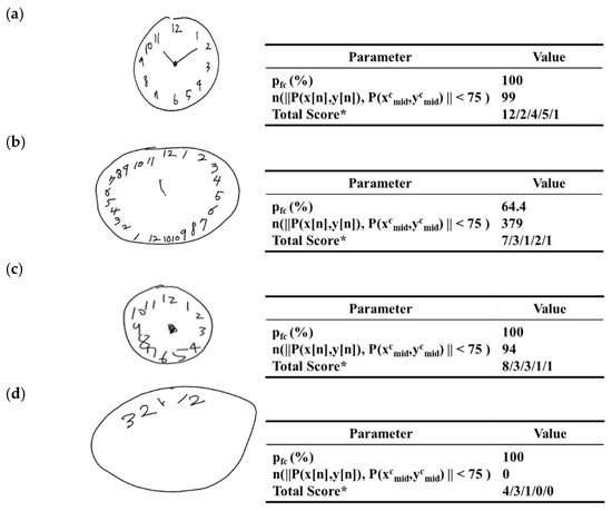 - De Pandis, M.F.; Galli, M.; Vimercati, S.; Cimolin, V.; De Angelis, M.V.; Albertini, G. A New Approach for the Quantitative Evaluation of the Clock Drawing Test: Preliminary Results on Subjects with Parkinson’s Disease. Neurol. Res. Int. 2010, 2010, 1–6. [Google Scholar] [CrossRef][Green Version]
