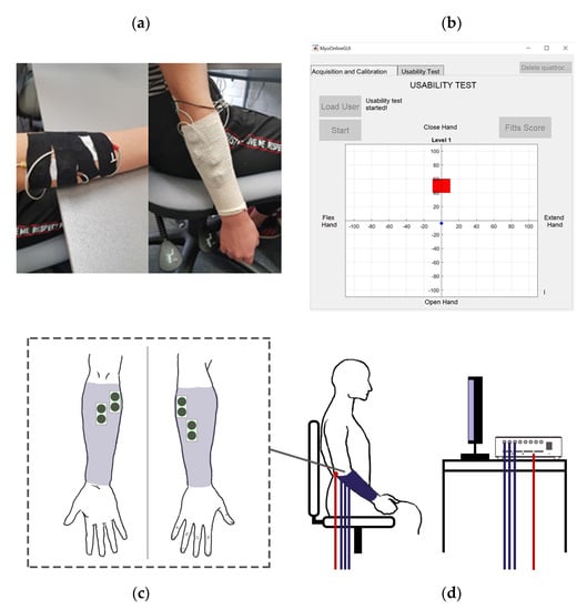 Experimental setup. (a) The electrodes are first placed with kinesiology tape and then secured with a bandage. (b) Usability test with the blue cursor and red target. (c) Positions of electrodes on the anterior and posterior sides of the right forearm. (d) Subject arrangement.