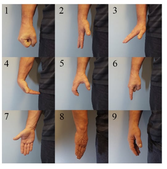 For the offline test, the patients are taken through a series of nine gestures: closed hand, open hand, wrist extension, wrist flexion, chuck grip, index pointing, supination, pronation, and rest. These can be seen in Figure 3. Each gesture is performed four times, each time for six seconds following a three-second count down, which allows the subject to prepare. There is a six-second rest period between each gesture to prevent muscle fatigue.
