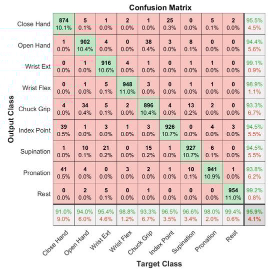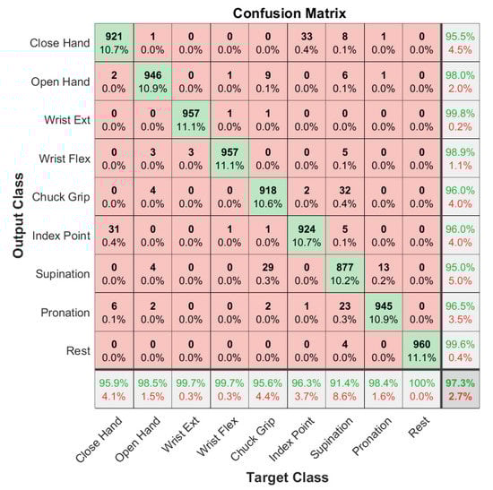 Offline models were trained and evaluated using the individual subject datasets for each electrode type and on a pooled dataset containing all electrode types. Table 2 shows the offline classification accuracy of models trained on individual subject data and their means and standard deviations. The mean accuracy across the three subject-specific models is 98.4% for the gel electrodes and 97.9% for the embroidered electrodes overall nine gestures. The classification accuracy for the general model trained on all gel electrode data is 97.3 ± 1.2%, and the accuracy for the model trained on all embroidered electrode data is 95.9 ± 1.2%. These can be seen in the respective confusion matrices (Figure 4 and Figure 5). The percentages in the main (red and green) square are total classifications made across all classes, so they sum to 100. Therefore, the numbers on the diagonal are the number of correct classifications for each class as a percentage of total classifications made. There are nine classes, so they would each be ~11.1% if the model classified each class perfectly. The accuracy in practice is close to this for both models, reflecting good accuracy.