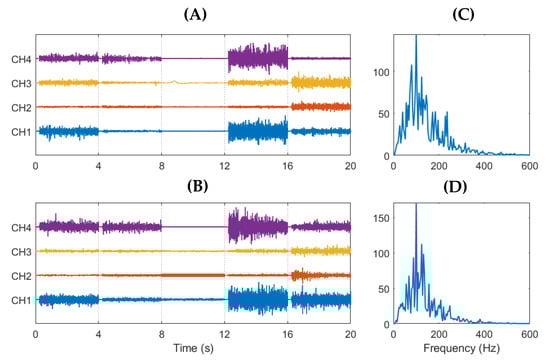 Example of recorded high-pass filtered signals from 4th gel and embroidered offline sessions of subject 1. EMG from gel electrodes (A) and embroidered electrodes (B). Power spectra of gel (C) and embroidered (D) signals. Samples of each gesture are four seconds in length, and gestures used, in order, are open hand, closed hand, relax, wrist extension, and wrist flexion. Y-axis are of arbitrary units.