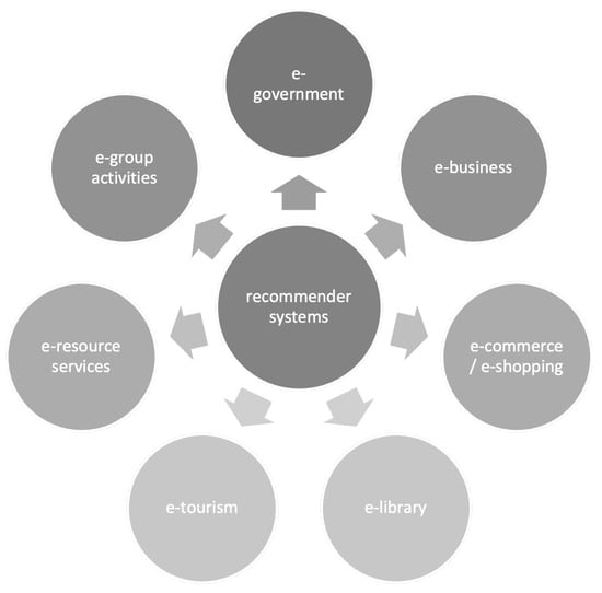 Recommender systems have proven useful in innumerable applications, and each year, new ways of employing the techniques are proposed. In their survey on the development of recommender system applications, the authors of [3] grouped the possible implementations into eight “e-“ categories, e-government, e-business, e-commerce/e-shopping, e-library, e-tourism, e-resource services, and e-group activities. The application domains have been shown in Figure 1.