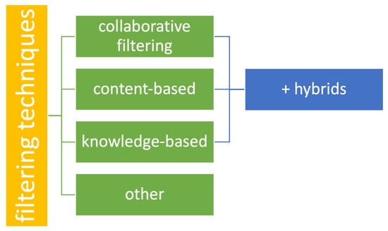 There are several techniques used for building recommendation systems. The most popular ones are: Collaborative Filtering (CF) [37], Content-Based (CB) [38] and Knowledge-Based (KB) [24]; they can also be combined to form various hybrids. The abovementioned types are the ones which most researchers agree on. However, there are other, less common methods that are mentioned by much fewer papers, or the researchers have different opinions on which group the methods should be classified into. This paper aims at mentioning at least most of the less-known and -used techniques, and lists them separately from the main three types. Figure 3 shows the division applied for the sake of this work.