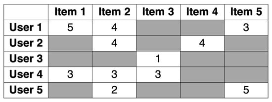 As this kind of filtering is based on the actions of the existing users, i.e., the recommendation is produced depending on the observations of the actions a new user takes and comparing them with the actions and ratings of the existing users, in most CF techniques, the generated preferences are based on a user–item matrix [19]. Such a matrix is built of a set of items and a set of users who reacted to some items. As [39] explains, this reaction may be either explicit (numeric rating, or expressing “likes” or “dislikes”) or implicit (i.e., the user’s behavior: clicking the link, the fact of viewing the item, adding it to a wishlist, or spending a certain amount of time on the item). A sample of a matrix of this kind has been presented in Figure 5.