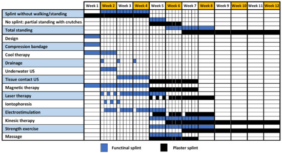 According to the previous study [10], the treatment programming is shown in black color in Figure 2. Traditional splints do not allow the application of physiotherapy techniques until the device is removed. However, by using new smart splints, it is possible to apply the treatments as soon as the injury occurs. It is possible to see the new timing possibilities in blue color in Figure 2.