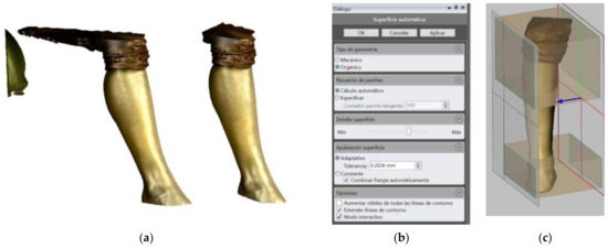 (a) Original and treated points cloud in Geomagic Software; (b) Mesh surface creation parameters; (c) Mesh manipulation.