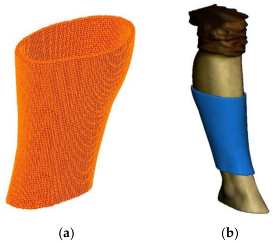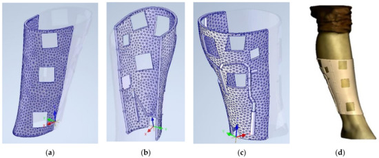Considering these factors, different windows are designed. For electrostimulation, 30 × 30 mm windows are made, whereas for drainage, iontophoresis, laser and ultrasound, the windows have a size of 30 × 40 mm. Furthermore, different housings for the sensors and wiring are considered. Figure 10a–c show both the back and front part after the designing process. Finally, the designed model is opened over the original mesh of the leg, obtained at the beginning of this process, to confirm it fits perfectly (Figure 10d).