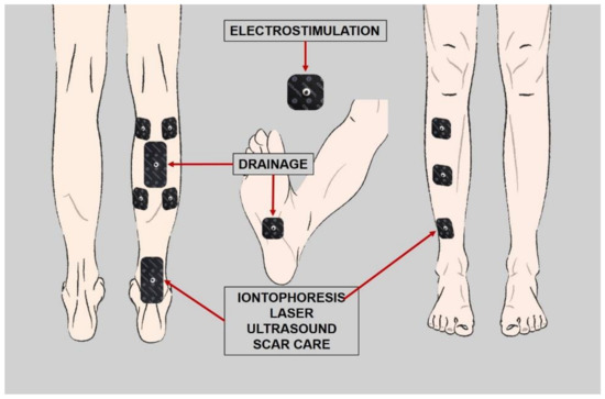 There are different considered treatments for the case under study. Lymph drainage uses Combined Decongestive Physiotherapy (CDP) for lymphedema which is recognized and reimbursed by insurance companies [19]. The basis of lymph drainage is to create different pathways through which lymph can flow. Electrodes may be used for this purpose [20,21]. Iontophoresis is one of the most used during rehabilitation treatment for delivery of anti-inflammatory and painkiller medication in the parts of the human body affected by inflammatory processes of the musculoskeletal system [22,23,24]. This way, some medications are able to pass through the skin and produce their effect, circumventing the digestive tract and without the need to have them administered by injection [25,26,27]. The Therapeutic Ultrasound technique is used in rehabilitation therapies for its mechanical, analgesic and circulatory effects and it should be applied in an aqueous medium (gel or immersion), something impossible with traditional splints [28]. It also improves the elasticity of the tissues [29]. It reduces the symptoms of inflammation and promotes tissue regeneration [30,31]. Normally the bones and the tendon connection area have low absorption capacity, so the frequency will depend on the injury [32,33]. Laser therapy accelerates energy metabolism and tissue synthesis as reported by several studies, [34,35,36]. Low-level laser stimulates the cells and modulates inflammatory processes [37,38,39], produces an increment of collagen production in the tendons structure [30,40,41,42] and reduces the levels of inflammation [43,44]. Electrostimulation for neuromuscular-skeletal mild to moderate pain is based on transcutaneous electrical nerve stimulation (TENS) and percutaneous electrical nerve stimulation (PENS) [45]. There are also different studies about the effects of electrostimulation on muscular strength and functional capacity in patients with osteoarthritis of the knee [46].