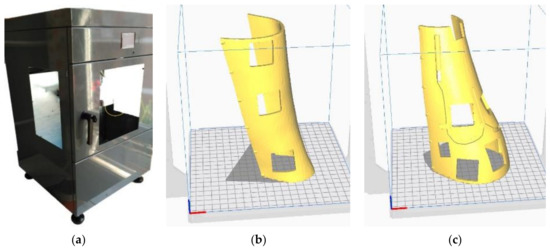 After the 3D scanning and design process, a .stl file is obtained that can be processed by a slicer software that prepares the model to be produced by using AM processing (Figure 11). In this case, a FDM 3D printer “TotalPrinter” machine was used. This printer was designed, developed, and manufactured in the Aditive Manufacturing and Rapid Prototype Laboratory of the Escuela Tecnica Superior de Ingenieria y Diseño Industrial at Technical University of Madrid (Spain). This printer allows controlled and continuous monitoring of printing parameters such as the thickness of the extruded thermoplastic filament [66], the humidity and temperature of the printing chamber and the temperature of the extruder [67] in order to optimize the printing process and to obtain a homogeneous model in terms of adhesion between the printed layers and mechanical characteristics [68].