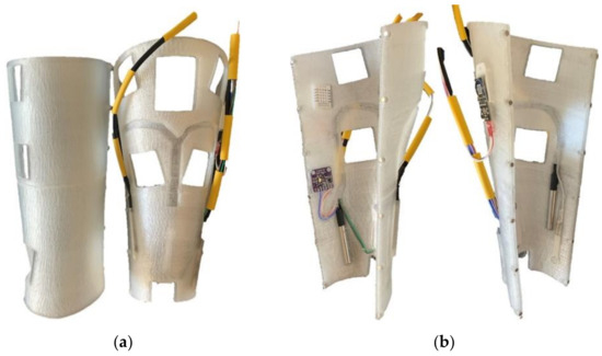 Figure 13a shows the splint prototype obtained with the wiring and sensors fully assembled. In Figure 13b it is possible to see the interior of the splint with the housing for the sensors.