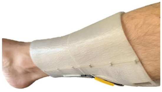 To test the fully assembled leg splint on a real leg, the splint was fixed to a healthy volunteer for 1.5 h (Figure 14). The volunteer was placed in seated position for the tests. However, this new “smart splint” is capable of obtaining data in a continuous way, so the patient does not need to adopt particular positions during the data acquisition. The main purpose of this test, was to collect data so that it could be analyzed if the sensors were able to acquire information correctly. The data collected by the sensors were treated with ESP32 micro and sent to a computer every 3 s by using the serial monitor of the Arduino platform. In the following sections the acquired data will be explained.