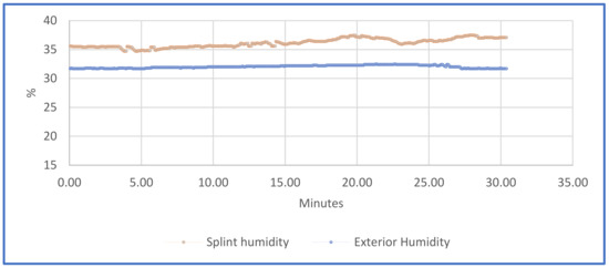 Monitoring the humidity inside the splint and its fluctuations allows us to know if the injured area is in a healthy environment and unsuitable for the proliferation of bacteria, especially in cases of surgery or injury. Furthermore, some physiological events that can occur following a trauma have been shown to include changes in skin color due to edema, changes in temperature and an increase in sweating in the area affected by the lesion [73]. In fact, a change in the sudomotor function of the injured part implies central disturbances of thermoregulation [17,74]. Figure 16 shows the percentage of humidity that was registered during the test inside the splint (in orange color) and outside the splint (in blue color).