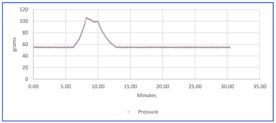 The surface of the pressure sensor during the limb immobilization phase is 1 cm2, according to 1 N = 1 Kg/s2 the pressure values read by the sensor will have the dimensions of Figure 18 shows the detected mean pressure. As illustrated, during the normal state, the value of the pressure is constant and is equal to 60 gf/cm2. However, when a slight pressure is produced due to an inflammatory process, the sensors are able to perfectly detect an increment of this pressure. In order to simulate what occurs in an inflammatory process, a force over the splint was applied between minutes 7 and 10. This variation was detected by the sensors, reading a pressure that rose from 60 gf/cm2 to 100 gf/cm2. Therefore, when the pressure was increased due to the inflammation of the area, the sensors perfectly detected the increment of the mass inside the splint [16]. The graph shows the actual and historical pressure. Real-time monitoring and the collection of historical data on the pressure variation of the injured area during the immobilization period allows the specialist to control inflammatory phenomena.