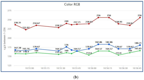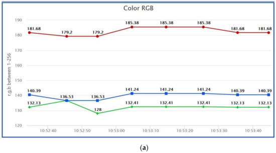 Two temperature sensors in contact with the skin were placed in two different zones. Moreover, a third sensor not in direct contact with the skin, read the temperature and humidity. The mean temperature of the first two sensors is shown in the color orange, whereas the internal temperature is shown in the color blue (Figure 15). The graph shows that the registered temperature by the sensor is slightly lower than 36 °C. This occurs because the exterior area of the sensor surface is not in real contact with the skin, and this produces a gradient of temperature between the environment and the body. However, what the authors are looking for in this study, is to detect an increment or decrement of the temperature of the located area of the skin, compared with the historical. It is perfectly possible to detect an increase or decrease of the registered temperature, in comparison with the historical data.