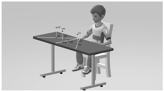 All testing sessions were performed in the same environmental conditions, i.e., during the morning and in the controlled environment of the Laboratoire de Neurophysique et Physiologie at the Hôpital R. Poincaré, Garches (France). During each session, at first a preliminary trial was carried out to familiarize the subject with the procedure, then the subject was asked to perform six repetitions of unilateral sitting reaching movement: three cycles with the left arm, and three with the right arm. As described in Robertson et al. [19] and Archetti et al. [30], the initial condition consisted in the subject with the hand placed on a red cross placed on the table plane in line with the shoulder, the forearm in mid-prone, the elbow flexed to 90°, and the humerus positioned along the vertical direction. In each repetition, the subject was asked to touch the target identified by the operator, among a set of possible pre-defined positions, which depicts combinations of the three directions left, center, and right, of the two quotes high and low, and of the two distances proximal and distal. Although the subject was oblivious to it, the target sequence submitted by the operator was standardized: close-middle (CM), far-internal (FI), high-external (HE), far-middle (FM), close-external (CE), high-internal (HI), close-internal (CI), far-external (FE), and high-middle (HM). The subjects were instructed to touch the target with a provided pointer and return to the starting position, performing the movement with opened eyes. No instructions were given on accuracy and speed, other than touching the target at a comfortable speed.