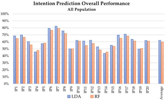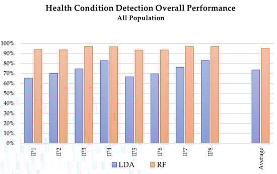 Comparing the overall performances of linear discriminant analysis (LDA) and random forest (RF) algorithms (see Figure 2 and Figure 6), LDA allows slightly better results to be reached for the intention prediction. Considering the whole dataset, the accuracy of RF was 79.22% at best (test IP_7), compared to 82.42% for LDA, whereas the average accuracy results were 59.91% for RF and 62.19% for LDA. On the contrary, RF proved to be particularly suitable for health condition detection, allowing accuracies of over 90% in all the tests.