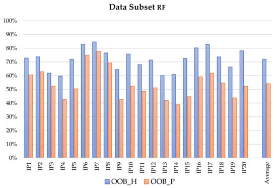 The RF algorithm demands an average training time of 1.14 s (range: 0.87–1.88), which decreases to an average value of 0.078 s (range: 0.035–0.28) for LDA. The prediction time was computed only for the tests with higher accuracy, i.e., IP1, IP2, IP6, and IP7. The average prediction time was 31 × 10−4 s (range: 30 × 10−4–33 × 10−4) for RF and 11 × 10−5 s (range: 10 × 10−5–12 × 10−5) for LDA.