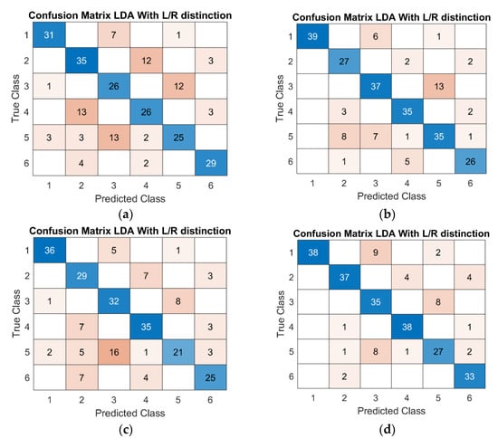 Example of LDA confusion matrixes with left and right limb distinction for (a) HD2, (b) HD4, (c) HD6, and (d) HD8. Testing dataset is 15% of the original data.