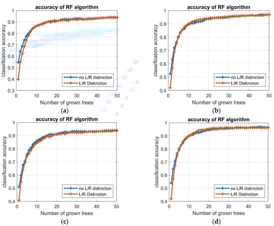 Example of RF accuracy with respect to the number of trees, for (a) HD1 (in blue) and HD2 (in red), (b) HD3 (in blue) and HD4 (in red), (c) HD5 (in blue) and HD6 (in red), and (d) HD7 (in blue) and HD8 (in red).
