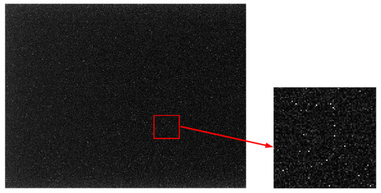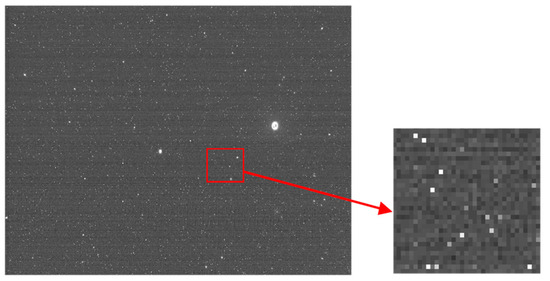 A star sensor [1] is a high-precision attitude measurement instrument that takes a star as a working object and calculates multiple reference vectors using multiple stars. The centroid extraction [2,3] of the star-point region has a great influence on the final precision of a star sensor. The factor affecting accuracy of centroid extraction can be attributed to the motion blur and the background noise [4]. The motion blur is generated by the fast motion of satellite under dynamic conditions. It will bring about the blur of the stars. There have been many studies [5,6,7,8] on this aspect. Most of them focused on the method of restoration of the star image. Generally, the background noise can be divided into two categories: single-pixel noise with only a single pixel, and large-area noise with a continuous change in the gray level. Single-pixel noise can be attributed to two main sources: the nonuniform response of a complementary metal oxide semiconductor (CMOS) detector [9] and the impact of cosmic radiation particles [10]. Large-area noise with a continuous change in the gray level is usually influenced by sunlight, moonlight, and earth-atmosphere light [11]. Considering the actual engineering requirements in the aerospace field, this paper aimed to develop a single-point noise elimination method.
