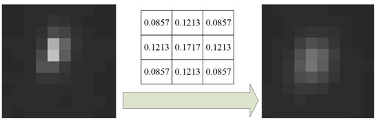 As shown in Figure 3, after denoising by Gaussian filtering, the inherent shape of the star point was destroyed, the energy of the star point was dispersed, and the edge became blurred. Thus, there was a significant drop in the values of and in Equation (1). Accordingly, the weight values of the central pixel and the pixel on the star edge decreased, which resulted in a deviation of (). Hence, a method to preserve the energy and edge of the star point is urgently needed.