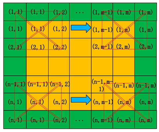 The output image after denoising is generated based on the calculated pixel instead of the original pixel. Step 1 is repeated until the last pixel has been calculated. As shown in Figure 6, the surrounding edge of the image (green fields) is filled with adjacent pixels (yellow fields) uniformly, and the filter templates (red dotted line) shift from left to right and from top to bottom.