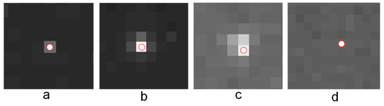 Four types of pixels in a star image: (a) a single pixel, which is characterized by a relatively bright pixel in the center and flat black pixels around it; (b) a standard central pixel of a star point, which is characterized by a relatively bright center pixel and approximate Gaussian distribution of the surrounding pixels; (c) an irregular central pixel of the Gaussian star point, which is characterized by a relatively bright pixel in the center and approximate Gaussian distribution on several sides, and the remaining part is the gentle background; and (d) pixels in a flat region with a small difference from the other pixels.
