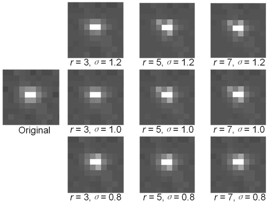 As shown in Figure 8, at the same value of , the increase in the filtering window size results in an abnormal energy distribution of star points. Considering that the high-brightness area is usually small and the Gaussian window size is larger, the star edge can be destroyed, as shown in Figure 8, where = 5 and = 7.