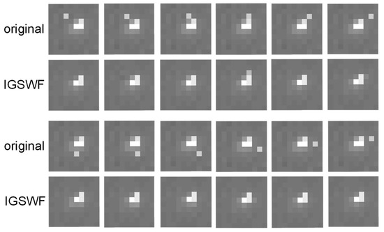 Firstly, the denoising effect of IGSWF on a star image with single-pixel noise was analyzed. As shown in Figure 10, the single-pixel noise position in the star image was not fixed in the original image. The local star-point region before and after IGSWF denoising was compared.