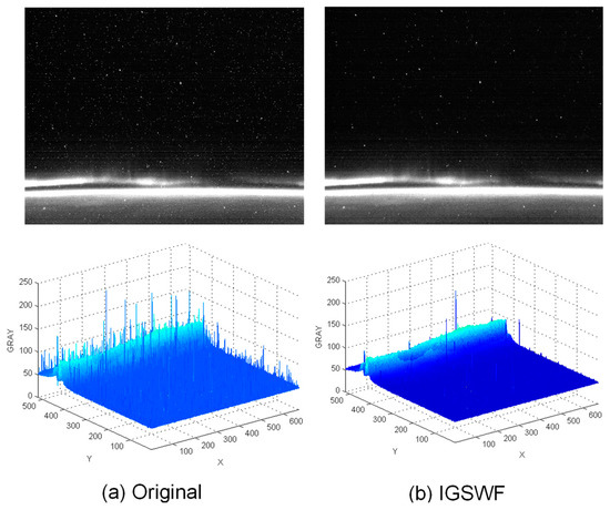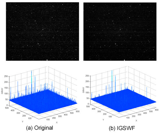 When a star sensor is in strong radiation zones, such as the South Atlantic Anomaly (SAA area) [22], there will be much random single-pixel noise in a star image, while fixed single-pixel noise is also generated when a star sensor is running at a high temperature. Therefore, the real effect in the original and denoised images was compared. The three-dimensional distribution of the grayscale in the star image was also used to analyze the performance of IGSWF.