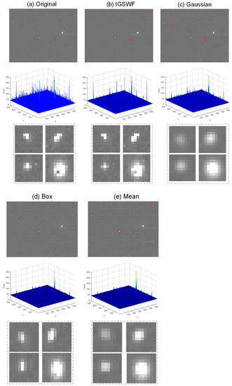The results in Figure 10 indicated that wherever the single-pixel noise existed in a star image, the IGSWF algorithm could effectively filter the noise without destroying the star shape. Therefore, by applying the proposed algorithm, the star-point region could be kept smooth while mitigating the influence on the star shape, which was beneficial for the calculation of the center of mass in the star-point region.
