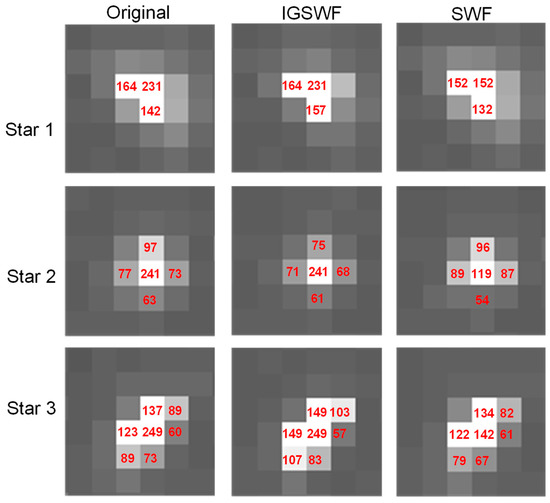 At the same time, the proposed IGSWF was compared with SWF regarding energy distribution and precision. Because SWF had a similar effect in protecting the star shape as the IGSWF algorithm, only the differences in the energy distribution and precision of star points were analyzed. In Figure 14, the first column represents the original energy distribution, the second column represents the energy distribution after IGSWF, and the third column represents the energy distribution after SWF. The relative proportion of the grayscale in the original star image was the closest to that after the IGSWF, which indicated that IGSWF maintained the energy distribution better than the SWF.