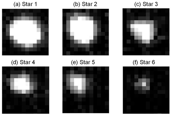 The six kinds of stars with different sizes: (a–f) Star 1 to Star 6 corresponded to 1 Mv, 2 Mv, 3 Mv, 4 Mv, 5 Mv, and 6 Mv, respectively.