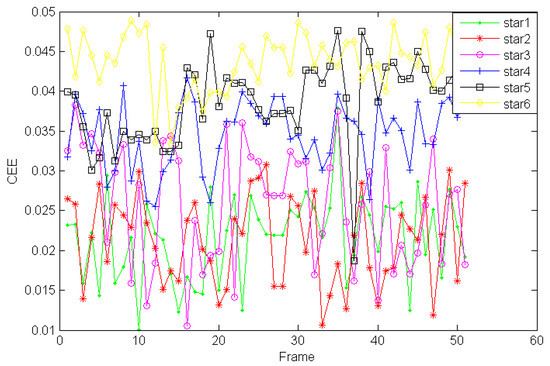 Firstly, in Figure 17, the dynamic star simulator generated six kinds of stars with different sizes. The six kinds of sizes corresponded to six kinds of star magnitude. Star 1 to Star 6 corresponded to 1 Mv, 2 Mv, 3 Mv, 4 Mv, 5 Mv, and 6 Mv, respectively. We calculated the CEE value (n = 1) for each star after IGSWF processing when the stars were rolling.