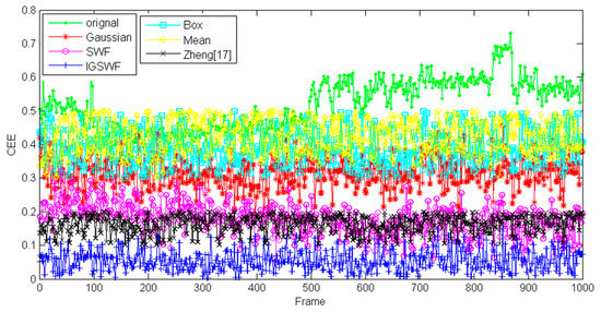 As shown in Figure 19, the deviation of the centroid extraction result was very large before denoising, and the CEE value fluctuated around 0.5. When traditional Gaussian filtering was adopted, the CEE value was superior to the original value and fluctuated around 0.35. When box filtering or mean filtering was adopted, the CEE value fluctuated around 0.4. After denoising by the SWF method, the deviation of the centroid extraction result was reduced quickly, and the CEE value fluctuated around 0.18. After processing according to Zheng [17], the CEE value fluctuated around 0.15, which was close to the SWF method. Lastly, after denoising by the IGSWF method, the deviation of the centroid extraction result was significantly reduced, and the CEE value fluctuated around 0.06. Based on the results, the CEE value after using the IGSWF algorithm was eight times smaller than the original value; six times smaller than that after traditional Gaussian filtering, box filtering, and mean filtering; and nearly three times smaller than that after the SWF and Zheng processing.