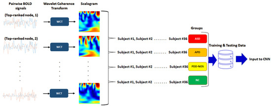 The WCT coefficients were represented as 2-D images involving the phase synchronization features of pairwise BOLD signals called scalogram images and will be used as the input of CNN for classification.