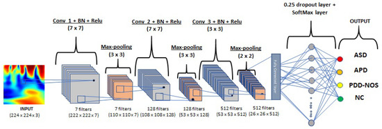CNN is one of the essential deep neural networks related to applying local convolution filters for extracting regional information. CNNs are designed to process multiple data types, particularly two-dimensional variables, and are specifically influenced by the working principle of the brain’s visual cortex. There is a hierarchy of two basic cell types in the visual cortex: plain cells and complex cells. Simple cells respond to primitive patterns in visual stimulation sub-regions, and complex cells synthesize information from simple cells to recognize more complicated types. Since the visual cortex is such an efficient and normal visual processing device, CNNs are used to mimic three main ideas: local connectivity, position invariance, and local transformation invariance. Groups of local weighted sums, called feature maps, are obtained at the end convolution layer by computing convolutions between local patches and weight vectors called filters for extracting the strongly clustered sub-regions of features. In addition, because similar patterns may occur irrespective of the data position, filters are repeatedly implemented throughout the whole dataset, which often increases the accuracy of the trained network by minimizing the amount of parameters to be trained [33]. In this work, We proposed a 3-layer CNN model for identifying ASD subtypes based on scalogram classification, using the CNN structure as shown in Figure 3.